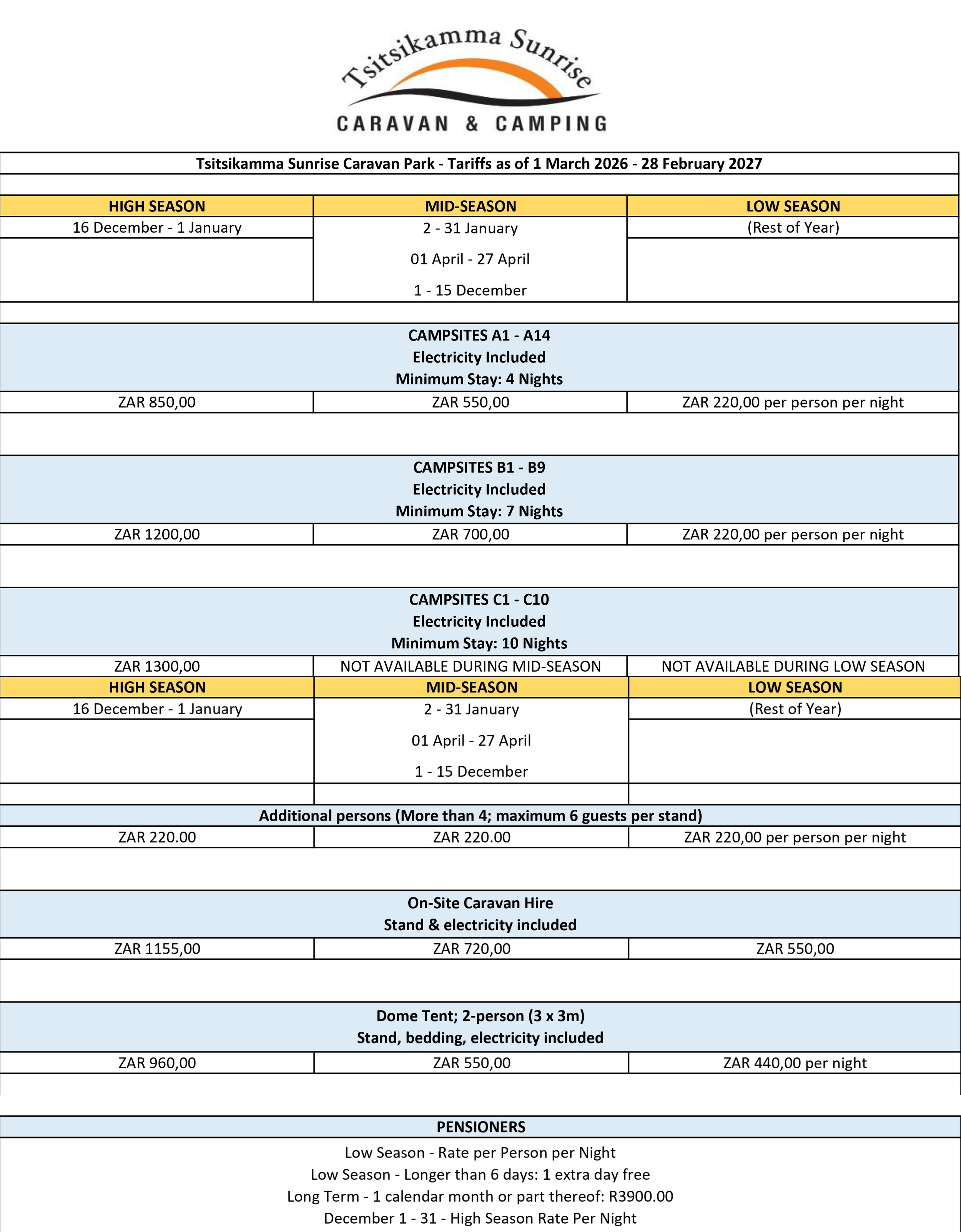 *Rates are subject to change without prior notice. All rates are indicated in South African Rands (ZAR) The online booking form does not constitute an agreement between Tsitsikamma Sunrise Caravan Park and a user, but constitutes an offer which may or may not be accepted by Tsitsikamma Sunrise Caravan Park.